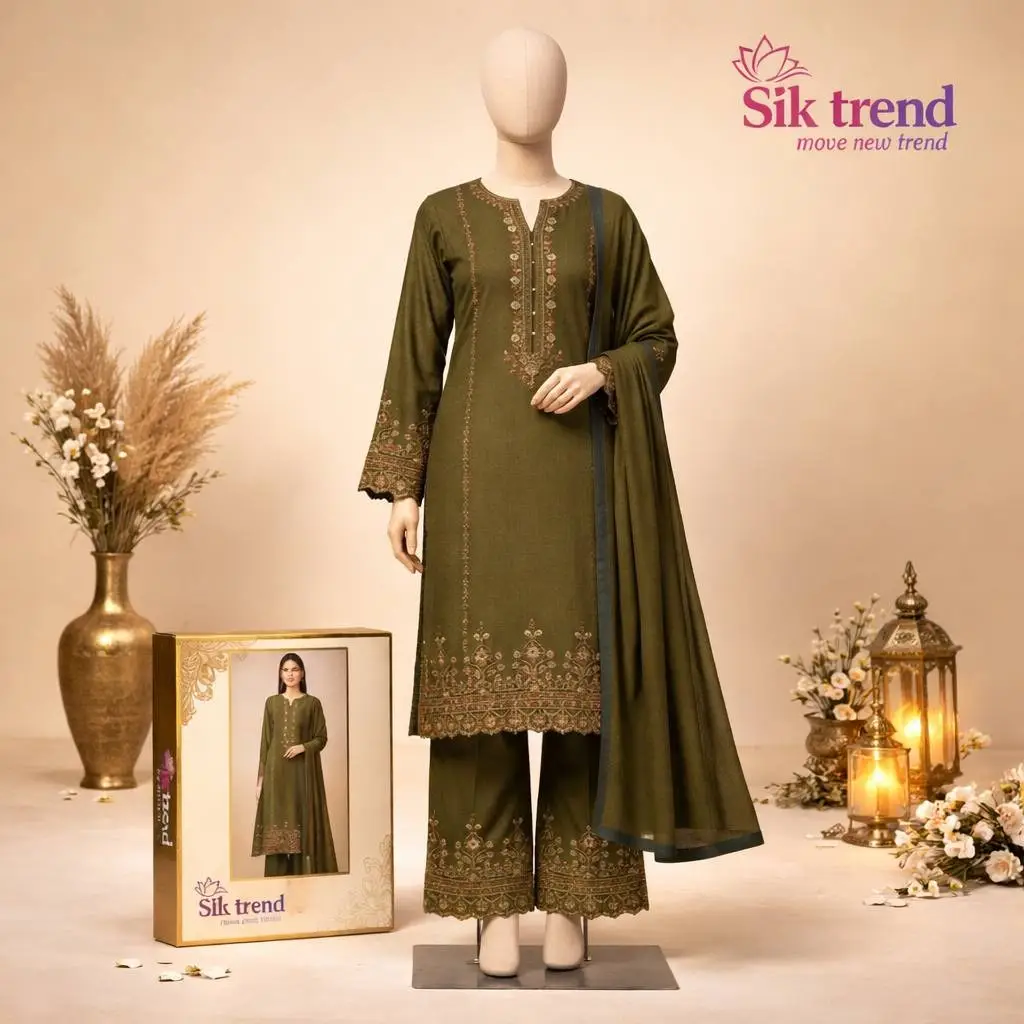 Elegant olive green 3-piece suit featuring delicate embroidery on the neckline, sleeves, and hem. Paired with a beautifully detailed trouser and matching chiffon dupatta, this outfit is perfect for festive gatherings and formal occasions. A timeless blend of grace and sophistication.